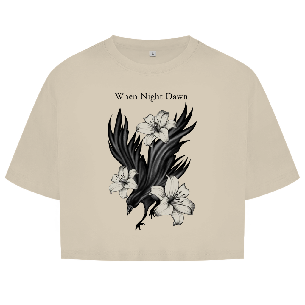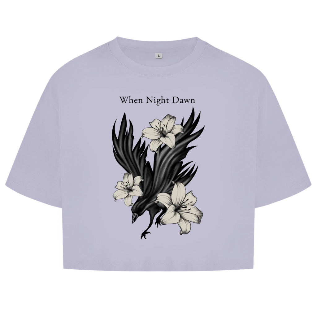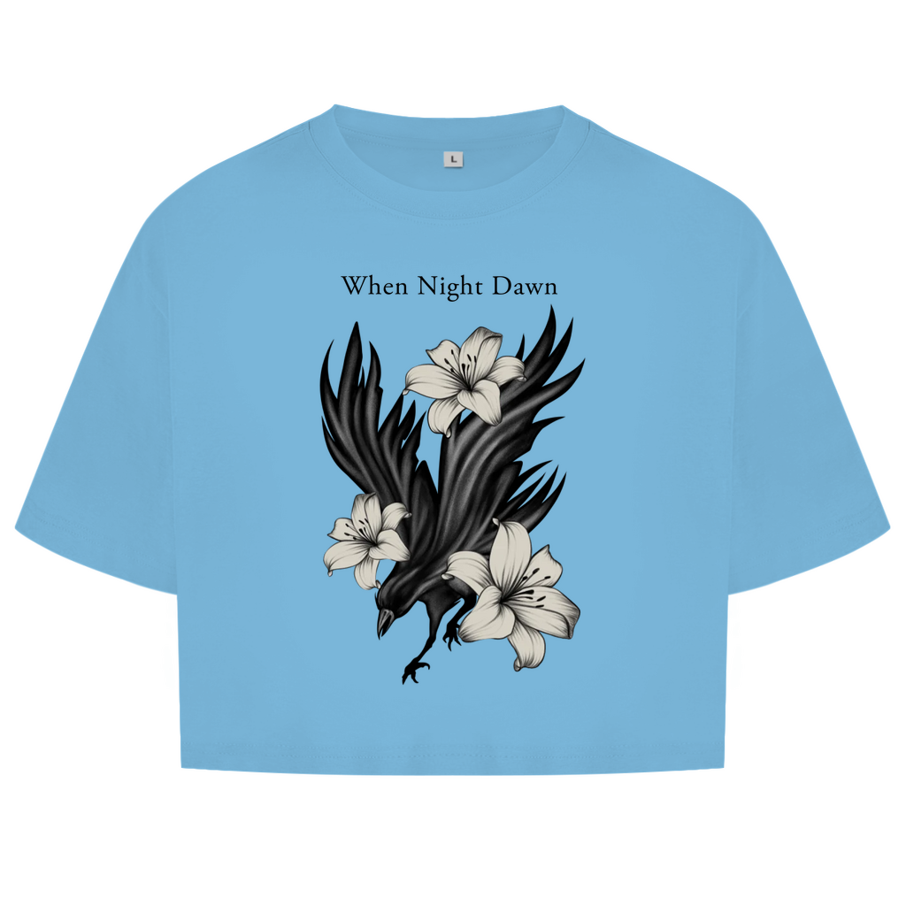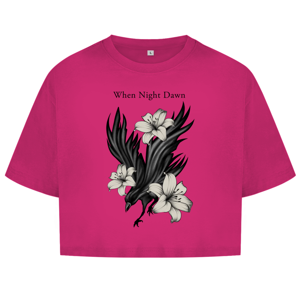 Das markante Design mit einem Raben, umgeben von Lilien, macht das Crop Top zu einem echten Statement-Piece. Der Rabe steht für Stärke und Geheimnis, die Lilien für Eleganz – eine kraftvolle Kombination, die dich überall begleitet.