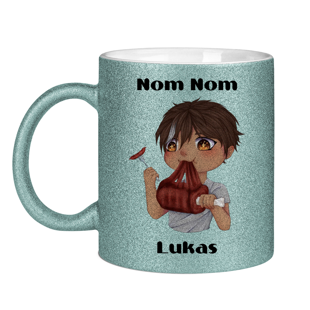 Die Glitzertasse mit Chibi-Anime-Herz-Motiv vereint Lebensfreude, Kreativität und Verspieltheit in einem funkelnden Design.