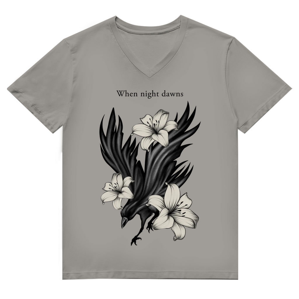 Das markante Design mit einem Raben, umgeben von Lilien, macht das Shirt zu einem echten Statement-Piece. Der Rabe steht für Stärke und Geheimnis, die Lilien für Eleganz – eine kraftvolle Kombination, die dich überall begleitet.