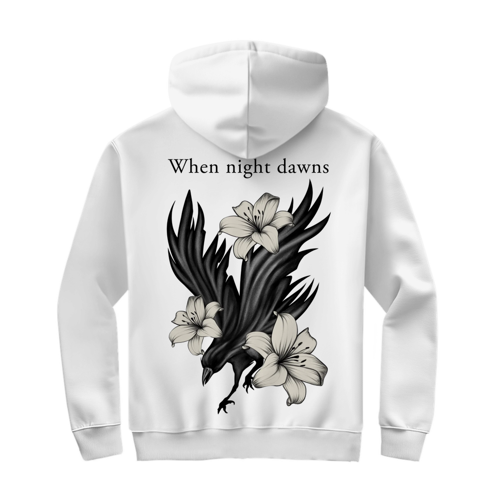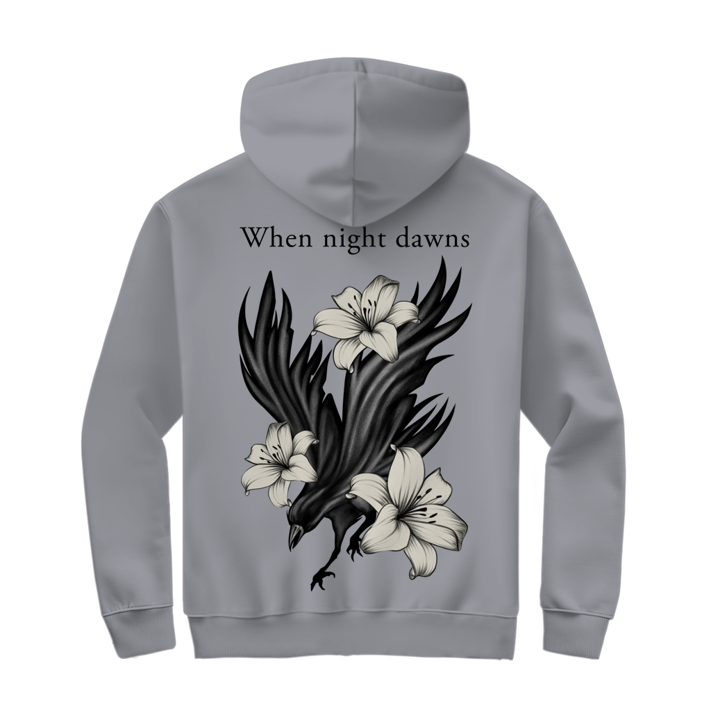 Das Motiv zeigt einen Raben, umgeben von Lilien – ein Symbol für Mystik, Eleganz und innere Kraft.