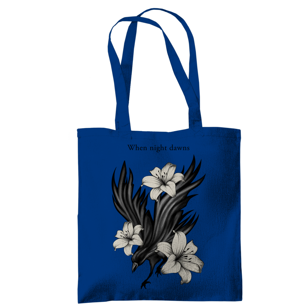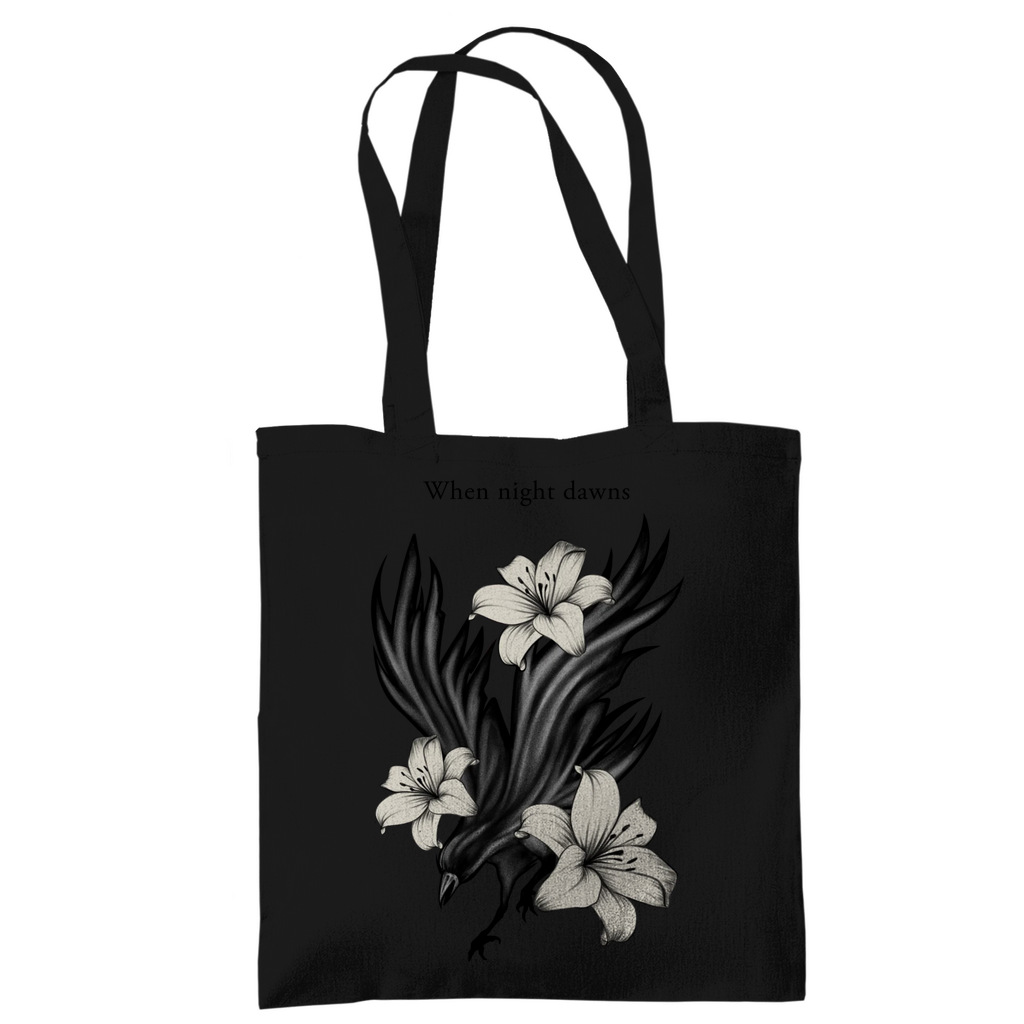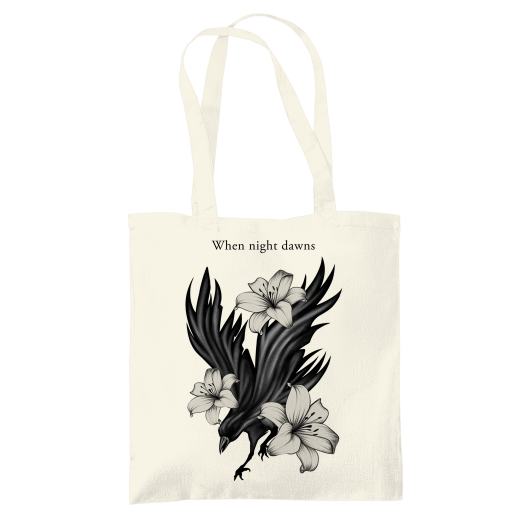 Das ausdrucksstarke Motiv zeigt einen Raben, umgeben von Lilien – Sinnbild für Mystik, Stärke und Eleganz.